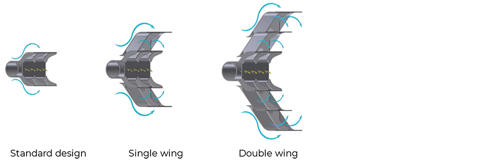 The special shape of the burner wings assures stable combustion over the total operating range resulting in low emissions of NOx, CO and UHC’s.