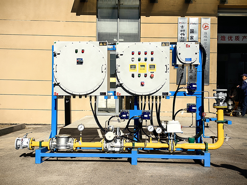 The pre-assembled gas train is furnished with inlet ball valve, gas strainer, double shut-off valve, pressure switches, leak detection pressure switch, pressure gauge, push button, electronic ratio control actuator and etc., it’s safely and preciously controls the burner and process temperature. The complete system was pre-assembled, painted, leakage and functional tested before shipment